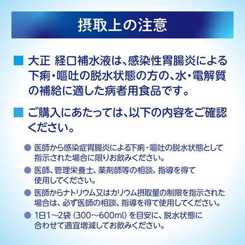 許可表示:大正 経口補水液は、感染性胃腸炎による下痢・嘔吐の脱水状態の方の、水・電解質の補給に適した病者用食品です。