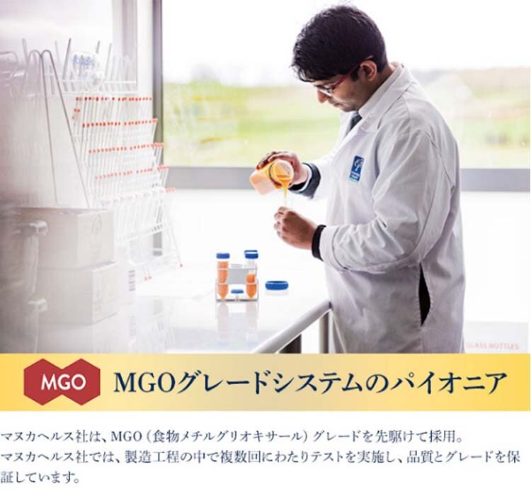 MGOの数値はマヌカハニー1kgあたりに含まれるMGO含有量(mg)を表します。本品には1kgあたりにMGOを400mg以上含む、MGO400+マヌカハニーを10%使用しています。
