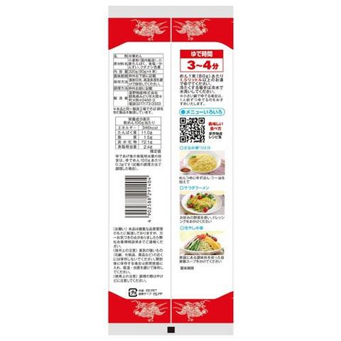 | 乾麺100gあたり エネルギー:346kcal、たんぱく質:11g、脂質:1.5g、炭水化物:72.1g、食塩相当量:2.4g、推定値 茹で上げ後の食塩相当量の目安は、ゆでめん100gあたり0.3gです。(記載の調理方法で調理した場合) |
