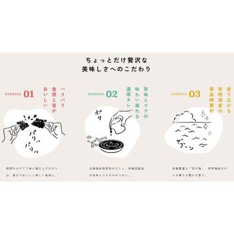 ●有明海産の一番摘み原料を使用し、ゆっくり時間をかけて丁寧に焼き上げ、北海道産の真昆布からとった清澄なだしと本醸造醤油(宮崎県製造)を絶妙に合わせた渾身のタレで仕上ました。