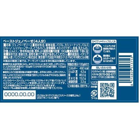 | 植物油脂、バジル、カシューナッツ、パルミジャーノ・レッジャーノチーズ、とうもろこし食物繊維、ホエイパウダー、食塩、乳たん白、砂糖、にんにく/香辛料抽出物、香料、pH調整剤 |