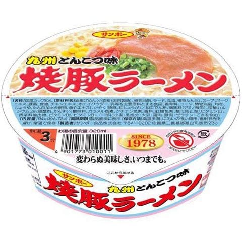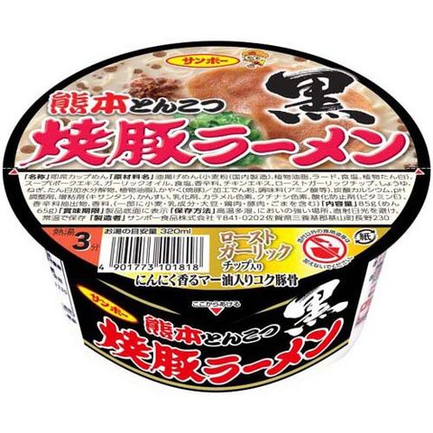 | ★焼豚ラーメン :油揚げめん(小麦粉(国内製造)、植物油脂、ラード、食塩、植物たん白)、スープ(ポークエキス、豚脂、食塩、チキンエキス、ホエイパウダー、乳等を主要原料とする食品、香辛料、コーン、植物油脂、ねぎ、しょうゆ、たん白加水分解物、魚介エキス)、かやく(焼豚、紅しょうが)/加工でん粉、調味料(アミノ酸等)、炭酸カルシウム、pH調整剤、かんすい、酸味料、カラメル色素、クチナシ色素、香料、紅麹色素、酸化防止剤(ビタミンE)、香辛料抽出物、ビタミンB2、ビタミンB1、(一部に小麦・乳成分・大豆・鶏肉・豚肉・ゼラチン・ごまを含む) ★焼豚ラーメン黒 熊本とんこつ:油揚げめん(小麦粉(国内製造)、植物油脂、ラード、食塩、植物たん白)、スープ(ポークエキス、ガーリックオイル、食塩、香辛料、チキンエキス、ローストガーリックチップ、しょうゆ、ねぎ、たん白加水分解物、植物油脂)、かやく(焼豚)/加工でん粉、調味料(アミノ酸等)、炭酸カルシウム、pH調整剤、増粘剤(キサンタン)、かんすい、乳化剤、カラメル色素、クチナシ色素、酸化防止剤(ビタミンE)、香辛料抽出物、香料、(一部に小麦・乳成分・大豆・鶏肉・豚肉・ごまを含む) ★焼豚ラーメン 長浜とんこつ:油揚げめん(小麦粉(国内製造)、植物油脂、ラード、食塩、植物たん白)、スープ(豚脂、ポークエキス、食塩、ごま、しょうゆ、香辛料、デキストリン、ねぎ、たん白加水分解物、植物油脂、魚介エキス)、かやく(焼豚、ごま)/加工でん粉、調味料(アミノ酸等)、炭酸カルシウム、かんすい、pH調整剤、乳化剤、増粘多糖類、カラメル色素、クチナシ色素、酸化防止剤(ビタミンE)、香辛料抽出物、酸味料、香料、(一部に小麦・乳成分・大豆・鶏肉・豚肉・ゼラチン・ごまを含む) |