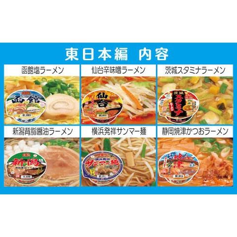 | ・函館塩ラーメン ・仙台辛味噌ラーメン ・新潟背脂醤油ラーメン ・茨城スタミナラーメン ・横浜発祥サンマー麺 ・静岡焼津かつおラーメン 各1 |
