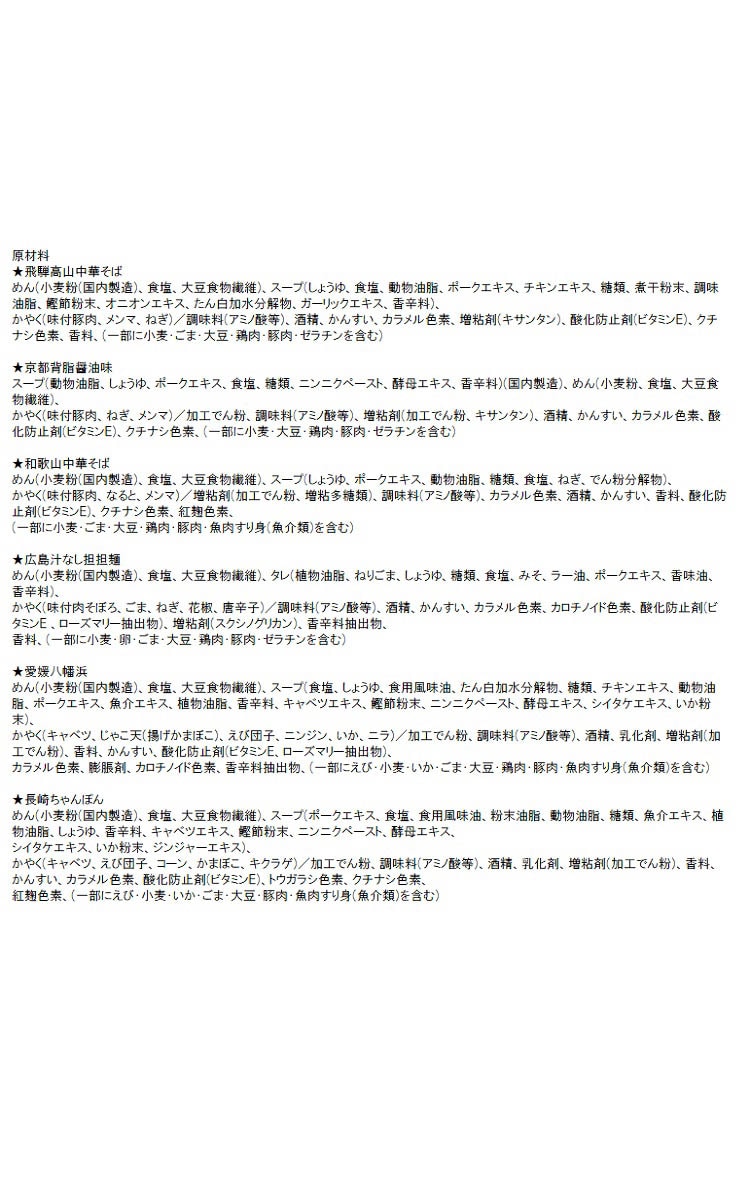 | ★飛騨高山中華そば 小麦・ごま・大豆・鶏肉・豚肉・ゼラチン ★京都背脂醤油味 小麦・大豆・鶏肉・豚肉・ゼラチン ★和歌山中華そば 小麦・ごま・大豆・鶏肉・豚肉・魚肉すり身(魚介類) ★広島汁なし担担麺 小麦・卵・ごま・大豆・鶏肉・豚肉・ゼラチン ★愛媛八幡浜 えび・小麦・いか・ごま・大豆・鶏肉・豚肉・魚肉すり身(魚介類) ★長崎ちゃんぽん えび・小麦・いか・ごま・大豆・豚肉・魚肉すり身(魚介類) |