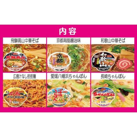 | ・飛騨高山中華そば ・京都背脂醤油味 ・和歌山中華そば ・広島汁なし担担麺 ・愛媛八幡浜 ・長崎ちゃんぽん 各1 |