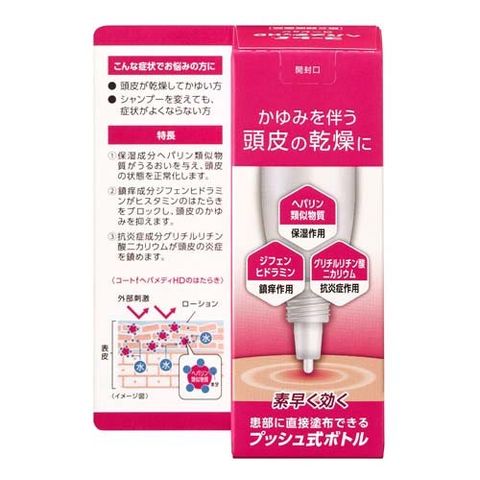 ●頭皮のかゆい箇所にコートfヘパメディHDを直接塗布することで、かゆみを抑え、炎症を鎮めるとともに、保湿成分ヘパリン類似物質が頭皮の状態を正常化します。