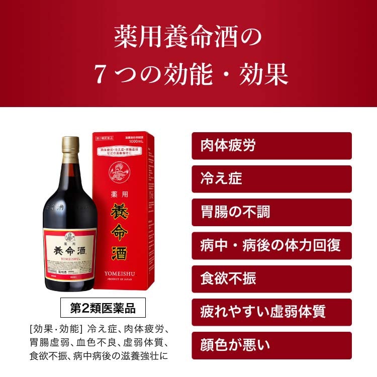 | 次の場合の滋養強壮:胃腸虚弱、食欲不振、血色不良、冷え症、肉体疲労、虚弱体質、病中病後 |