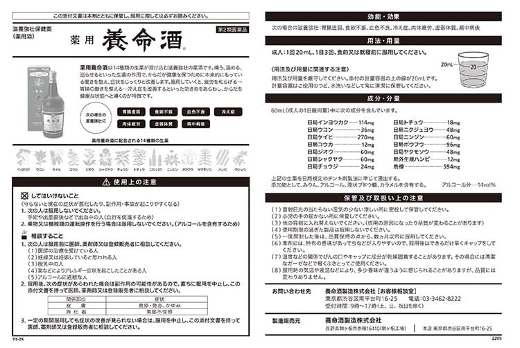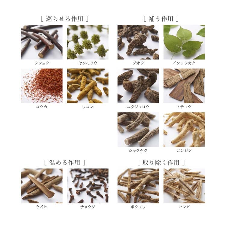 | 60mL(成人の1日服用量)の中に次の成分を含んでいます。 日局インヨウカク:114mg 日局ウコン:36mg 日局ケイヒ:270mg 日局コウカ:12mg 日局ジオウ:60mg 日局シャクヤク:60mg 日局チョウジ:24mg 日局トチュウ:18mg 日局ニクジュヨウ:48mg 日局ニンジン:60mg 日局ボウフウ:96mg 日局ヤクモソウ:48mg 局外生規ハンピ:12mg 烏樟:594mg 上記の生薬を日局規定のチンキ剤製法に準じて浸出する。 添加物として、みりん、アルコール、液状ブドウ糖、カラメルを含有する。 アルコール分:14vol% |