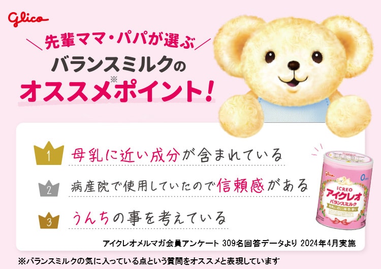 許可表示:母乳は赤ちゃんにとって最良の栄養です。「アイクレオバランスミルク」は母乳が不足したり与えられない場合に母乳の代わりをする目的で作られたものです。