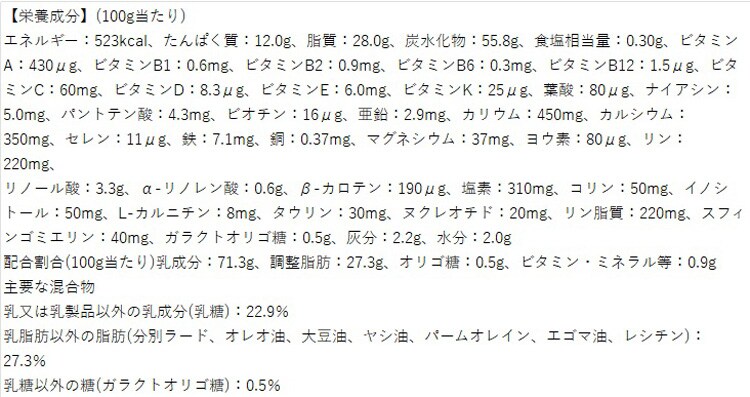 | 調整食用油脂(分別ラード、オレオ油、大豆油、ヤシ油、パームオレイン)(国内製造)、ホエイパウダー、乳糖、脱脂粉乳、たんぱく質濃縮ホエイパウダー、ガラクトオリゴ糖、エゴマ油/レシチン、塩化カルシウム、水酸化カルシウム、ビタミンC、タウリン、イノシトール、硫酸第一鉄、硫酸亜鉛、5'-シチジル酸、ビタミンE、5'-ウリジル酸ナトリウム、ニコチン酸アミド、パントテン酸カルシウム、5'-アデニル酸、5'-イノシン酸ナトリウム、5'-グアニル酸ナトリウム、硫酸銅、ビタミンB1、ビタミンA、ビタミンB2、ビタミンB6、β-カロテン、葉酸、ビオチン、ビタミンD3、ビタミンB12、(一部に乳成分・大豆を含む) |