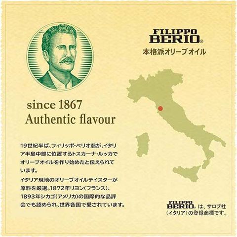 ●「FILIPPO BERIO」オリーブオイル はイタリアの伝統ブランドでイタリア半島中部に位置するトスカーナ・ルッカで オリーブオイルを作りはじめたと伝えられています。