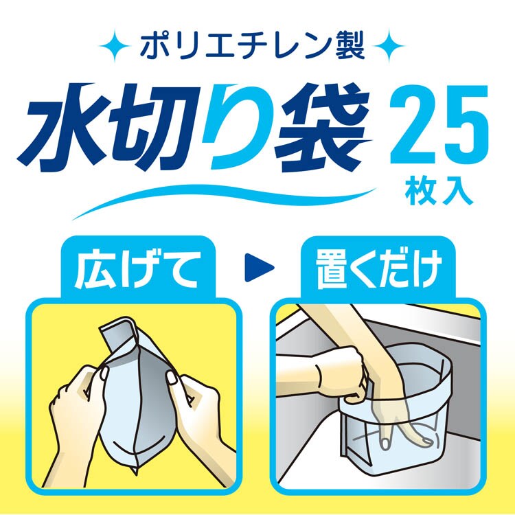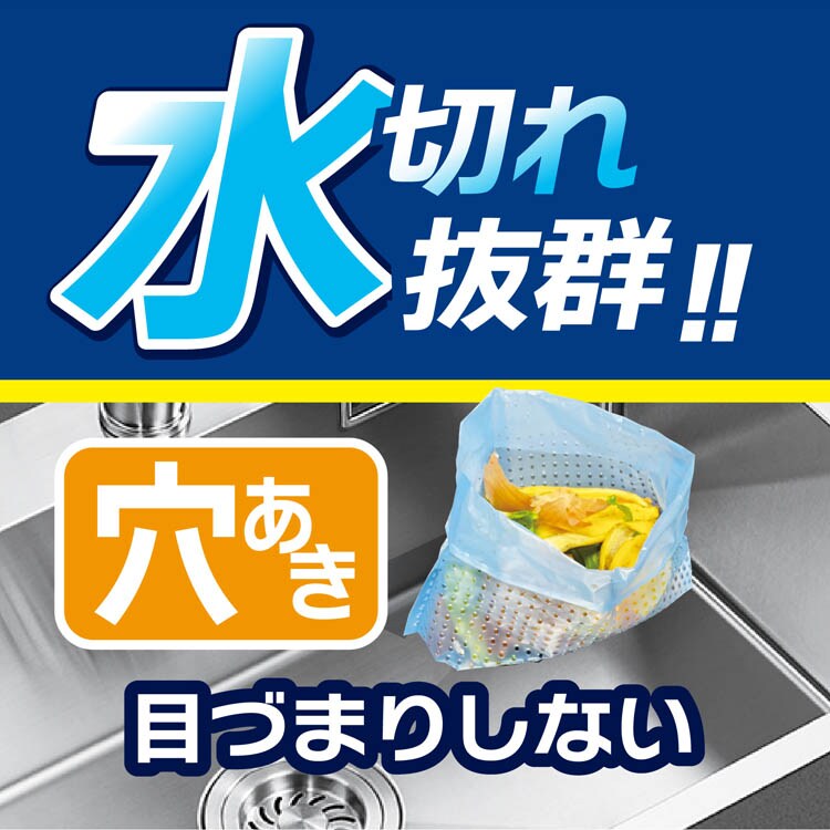 ●穴あきタイプで水切れが抜群!!自立型で三角コーナーいらずのポリエチレン製水切り袋。