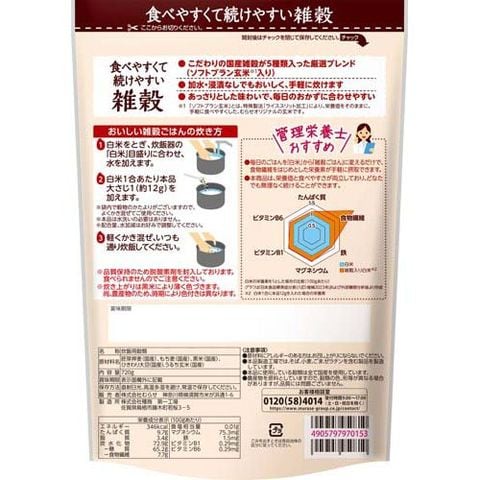 | 胚芽押麦(国産)、もち麦(国産)、黒米(国産)、ひきわり大豆(国産)、うるち玄米(国産) |