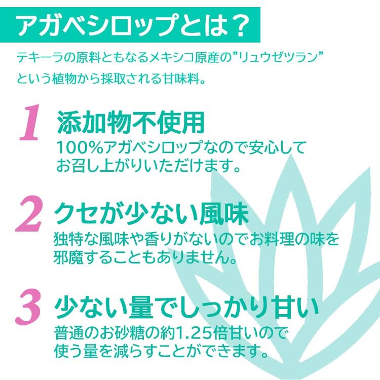 ●テキーラの原料で同じみの竜舌蘭から採取される甘味料です。