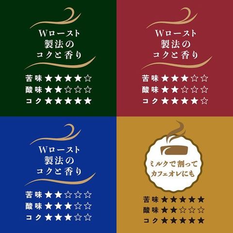 | ★深いコクのスペシャルブレンド:コーヒー豆(生豆生産国名:ベトナム、ホンジュラス他) ★あまい香りのリッチブレンド:コーヒー豆(生豆生産国名:ブラジル、ベトナム) ★まろやか味のマイルドブレンド:コーヒー豆(生豆生産国名:ベトナム、ブラジル) ★ビターな味わいのクラシックブレンド:コーヒー豆(生豆生産国名:ベトナム、ブラジル) |