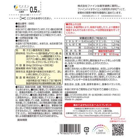| 栄養成分表示(7粒当たり) エネルギー:8.45kcal、たんぱく質:0g、脂質:0.05g、炭水化物:2g、食塩相当量:0g、ビタミンB1:1.1mg、ビタミンB2:1.2mg、ビタミンB6:1.1mg 機能性関与成分 クエン酸:810mg |