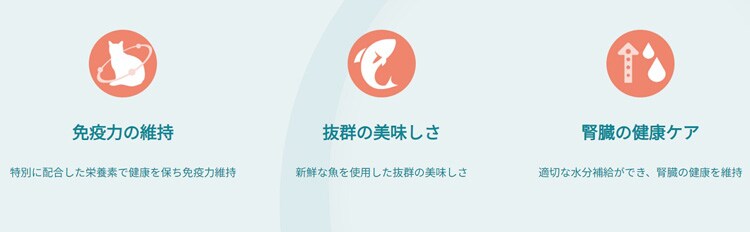 ●新鮮な魚を使用した抜群の美味しさ。適切な水分量で腎臓の健康を維持。「健康免疫システム」で猫本来の健康を保ち、免疫力を維持。
