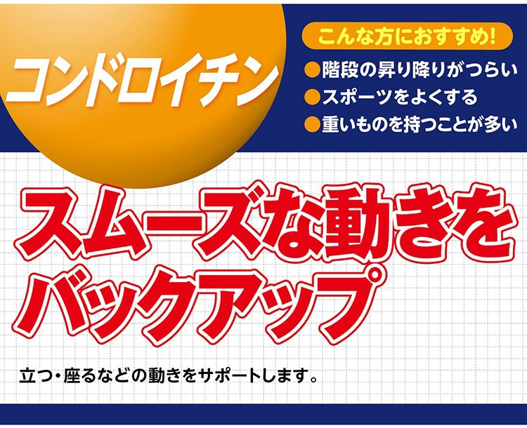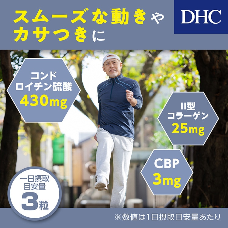 ●DHCの「コンドロイチン」は、不足しがちなコンドロイチンを摂りやすいサプリメントにし、II型コラーゲン、CBP、ローヤルゼリー、カキエキス、亜鉛も配合。スムーズな動きをサポートします。