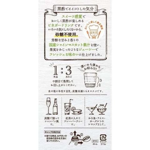 | 米黒酢(国内製造)、シャインマスカット果汁、食塩/酸味料、香料、甘味料(アセスルファムカリウム、スクラロース) |
