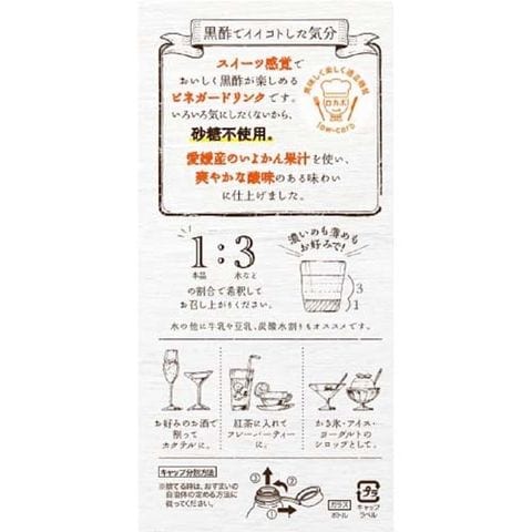 | 米黒酢(国内製造)、いよかん濃縮、果汁/酸味料、甘味料(スクラロース、アセスルファムカリウム、ステビア)、香料、カロチン色素 |