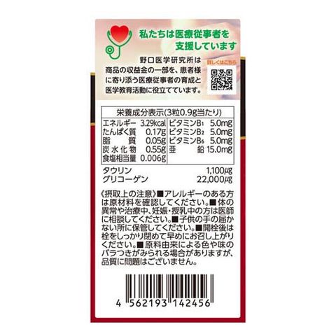 | 栄養成分表示(3粒あたり) エネルギー:3.29kcal、たんぱく質:0.17g、脂質:0.05g、炭水化物:0.55g食塩相当量:0.006g、亜鉛:15mg、ビタミンB1:5.0mg、ビタミンB2:5.0mg、ビタミンB6:5.0mg、牡蠣肉濃縮エキス:220mg(タウリン、グリコーゲン含有) |