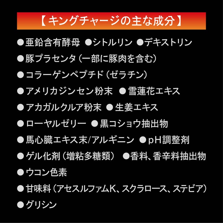 | 砂糖、亜鉛含有酵母、シトルリン、デキストリン、豚プラセンタ(豚肉を含む)、コラーゲンペプチド(ゼラチン)、アメリカジンセン粉末、雪蓮花エキス、アカガルクルア粉末、生姜エキス、ローヤルゼリー、黒コショウ抽出物、 馬心臓エキス末/アルギニン、pH調整剤、ゲル化剤(増粘多糖類)、香料、香辛料抽出物、ウコン色素、甘味料(アセスルファムK、スクラロース、ステビア)、グリシン |