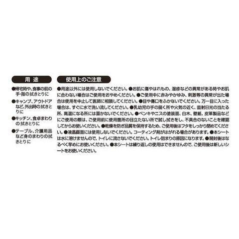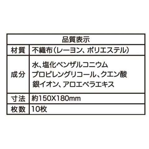 | ・シートサイズ・・・約150×180mm ・材質・・・材質・・・不織布(レーヨン、ポリエステル) ・成分・・・水、塩化ベンザルコニウム、プロピレングリコール、クエン酸、銀イオン、アロエベラエキス |