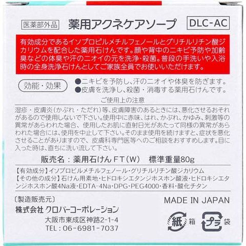 | ・ニキビを予防し、汗のニオイや体臭を防ぎます。 ・皮膚を洗浄し、殺菌・消毒する薬用石けんです。 |