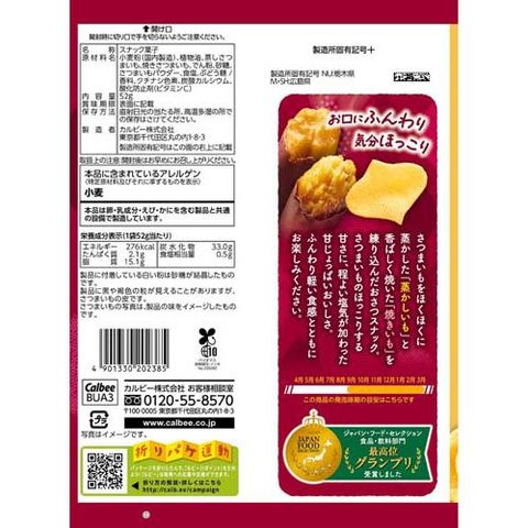 | 小麦粉(国内製造)、植物油、蒸しさつまいも、焼きさつまいも、でん粉、砂糖、さつまいもパウダー、食塩、ぶどう糖/香料、クチナシ色素、炭酸カルシウム、酸化防止剤(ビタミンC) |