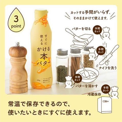 ●液状なので、サッとかけるだけでトーストやバターコーヒー、料理に手軽にお使い頂けます。