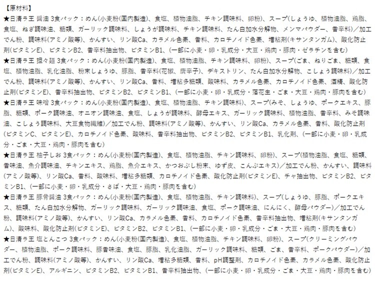 | ★醤油:小麦、卵、乳、大豆、鶏肉、豚肉、ゼラチン ★担々麺:小麦、卵、乳、落花生、ごま、大豆、鶏肉、豚肉 ★味噌:小麦、卵、乳、ごま、大豆、鶏肉、豚肉 ★柚子しお:小麦、卵、乳、さば、大豆、鶏肉、豚肉 ★豚骨醤油:小麦、卵、乳、ごま、大豆、鶏肉、豚肉 ★塩とんこつ:小麦、卵、乳、ごま、大豆、鶏肉、豚肉 |