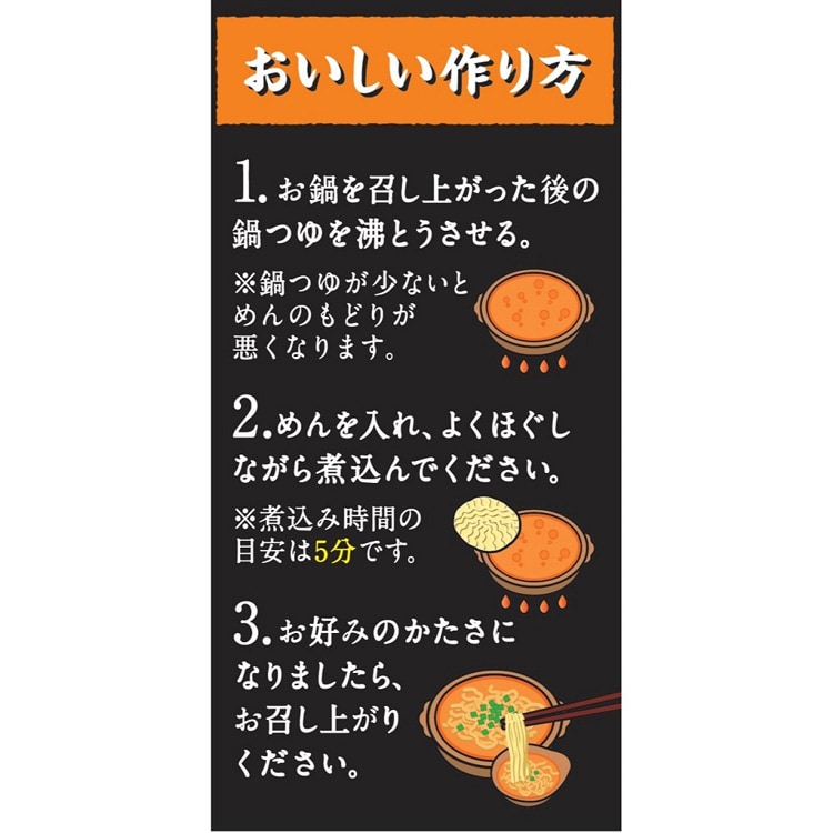 1.お鍋を召し上がった後の鍋つゆを沸とうさせる。※鍋つゆが少ないとめんのもどりが悪くなります。2.めんを入れ、よくほぐしながら煮込んでください。※煮込み時間の目安は5分です。3.お好みのかたさになりましたら、お召し上がりください。