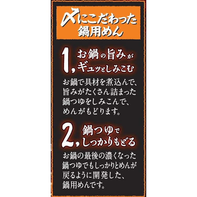 ●キムチ鍋や豚骨醤油鍋などのこってり系の鍋つゆに合う、もちもちの食べ応え太ちぢれめんです。個食やファミリーにも合わせやすい2食パック。