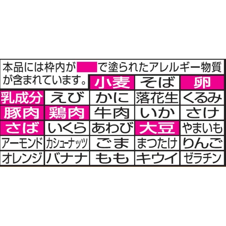 | 小麦、卵、乳、さば、大豆、鶏肉、豚肉 |
