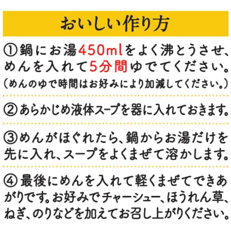 お好みでチャーシュー、ほうれん草、ねぎ、のりなどを加えてお召し上がりください。