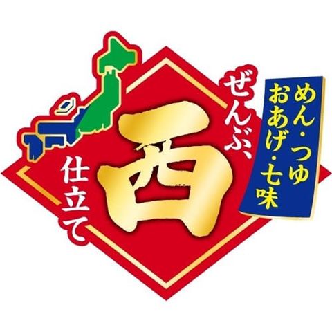 油揚げめん(小麦粉(国内製造)、そば粉、植物油脂、植物性たん白、食塩、しょうゆ、かつおぶし粉末、糖類)、かやく(天ぷら)、スープ(糖類、食塩、かつおぶし調味料、粉末しょうゆ、かつおぶし粉末、ねぎ、わかめ、七味唐辛子、たん白加水分解物、こんぶ調味料、こんぶ粉末)/加工でん粉、調味料(アミノ酸等)、リン酸塩(Na)、炭酸Ca、カラメル色素、香料、酸化防止剤(ビタミンE)、カロチノイド色素、pH調整剤、ベニコウジ色素、ビタミンB2、チャ抽出物、ビタミンB1、(一部にえび・小麦・そば・卵・乳成分・ごま・大豆を含む)