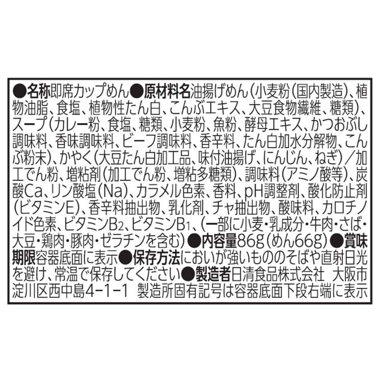 油揚げめん(小麦粉(国内製造)、植物油脂、食塩、植物性たん白、こんぶエキス、大豆食物繊維、糖類)、スープ(カレー粉、食塩、糖類、小麦粉、魚粉、酵母エキス、かつおぶし調味料、香味調味料、ビーフ調味料、香辛料、たん白加水分解物、こんぶ粉末)、かやく(大豆たん白加工品、味付油揚げ、にんじん、ねぎ)/加工でん粉、増粘剤(加工でん粉、増粘多糖類)、調味料(アミノ酸等)、炭酸Ca、リン酸塩(Na)、カラメル色素、香料、pH調整剤、酸化防止剤(ビタミンE)、香辛料抽出物、乳化剤、チャ抽出物、酸味料、カロチノイド色素、ビタミンB2、ビタミンB1、(一部に小麦・乳成分・牛肉・さば・大豆・鶏肉・豚肉・ゼラチンを含む)