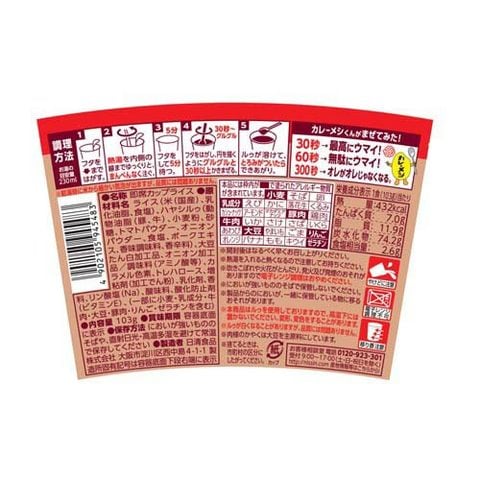 | ライス(米(国産)、乳化油脂、食塩)、ハヤシルゥ(動物油脂(豚、牛)、小麦粉、砂糖、トマトパウダー、オニオンパウダー、食塩、ポークエキス、香味調味料、香辛料)、大豆たん白加工品、オニオン加工品/調味料(アミノ酸等)、カラメル色素、トレハロース、増粘剤(加工でん粉)、乳化剤、香料、リン酸塩(Na)、酸味料、酸化防止剤(ビタミンE)、(一部に小麦・乳成分・牛肉・大豆・豚肉・りんご・ゼラチンを含む) |