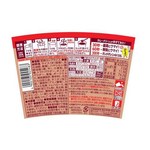 ライス(米(国産)、乳化油脂、食塩)、ハヤシルゥ(動物油脂(豚、牛)、小麦粉、砂糖、トマトパウダー、オニオンパウダー、食塩、ポークエキス、香味調味料、香辛料)、大豆たん白加工品、オニオン加工品/調味料(アミノ酸等)、カラメル色素、トレハロース、増粘剤(加工でん粉)、乳化剤、香料、リン酸塩(Na)、酸味料、酸化防止剤(ビタミンE)、(一部に小麦・乳成分・牛肉・大豆・豚肉・りんご・ゼラチンを含む)