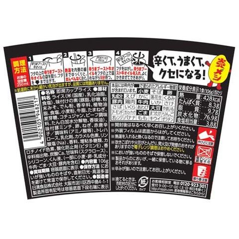 | ライス(米(国産)、乳化油脂、食塩)、味付けの素(豚脂、砂糖、粉末みそ、でん粉、香辛料、植物油脂、食塩、小麦粉、牛脂、たまねぎ、麦芽糖、コチュジャン、ビーフ調味料、たん白加水分解物、香味油)、味付豚ミンチ、卵、ねぎ、赤唐辛子/調味料(アミノ酸等)、トレハロース、乳化剤、カラメル色素、リン酸塩(Na)、香料、増粘多糖類、カロチノイド色素、酸化防止剤(ビタミンE)、香辛料抽出物、炭酸Ca、甘味料(スクラロース)、シリコーン、くん液、(一部に小麦・卵・乳成分・牛肉・ごま・大豆・豚肉を含む) |