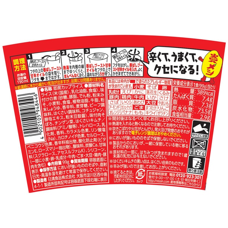 やけどにご注意ください。※給湯時に米から細かい気泡が出ますが、品質には問題ありません。※原材料の一部に、はちみつが含まれますので1歳未満の乳児には与えないでください。※はくさいキムチの黒い点は、はくさい由来のものです。※辛みが強いので注意してお召し上がりください。