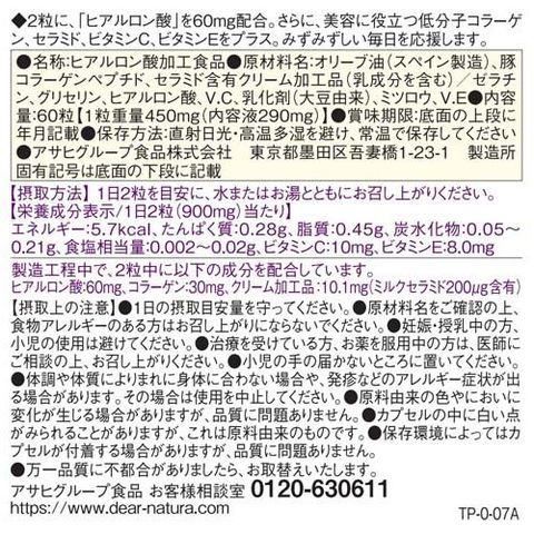 | 1日2粒(900mg)当たり エネルギー:5.7kcal、たんぱく質:0.28g、脂質:0.45g、炭水化物:0.05- 0.21g、食塩相当量:0.002-0.02g、ビタミンC:10mg、ビタミンE:8.0mg 製造工程中で、2粒中に以下の成分を配合しています。 ヒアルロン酸:60mg、コラーゲン:30mg、クリーム加工品:10.1mg(ミルクセラミド200μg含有) |