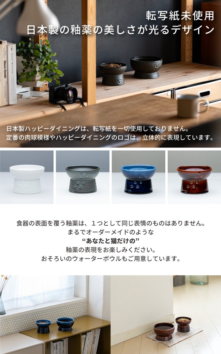 日本製ハッピーダイニングは、転写紙を一切使用しておりません。定番の肉球模様やハッピーダイニングのロゴは、立体的に表現。日本製の美しい釉薬の表現をお楽しみいただければ嬉しいです。