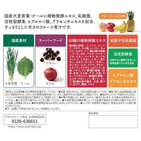 | 大麦若葉粉末(大麦若葉(九州産))、水溶性食物繊維、ケール粉末、穀物発酵エキス末(小麦を含む)、酵母エキス末、りんご果汁粉末、ピーチ果汁粉末、パイナップル果汁粉末、バナナ粉末、有胞子性乳酸菌末、ザクロ果汁粉末、アサイー粉末、植物発酵エキス末(くるみ・オレンジ・ごま・大豆を含む)、豚プラセンタエキス末/酸味料、香料、甘味料(ステビア)、ヒアルロン酸 |