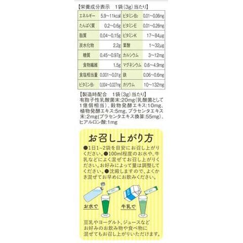 | 栄養成分表示 1袋(3g)当たり エネルギー 5.9~11kcal、たんぱく質 0.2~0.6g、脂質 0.04~0.15g、炭水化物 2.2g(糖質 0.45~0.97g、食物繊維 1.5g)、食塩相当量 0.001~0.01g、ビタミンB1 0.004~0.027mg、ビタミンB2 0.01~0.06mg、ビタミンE 0.01~0.26mg、ビタミンK 17~84μg、葉酸 1~32μg、カルシウム 3~12mg、マグネシウム 0.6~4.9mg、鉄 0.06~0.6mg、カリウム 10~132mg、 製造時配合 1袋 (3g)当たり 有胞子性乳酸菌末:20mg (乳酸菌として 1億個相当)、穀物発酵エキス:10mg、植物発酵エキス:5mg、プラセンタエキス末:2mg(プラセンタエキス換算:55mg)、ヒアルロン酸:1mg |