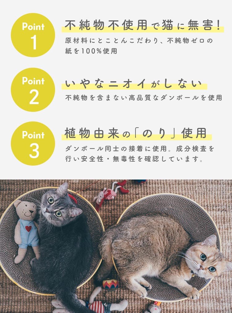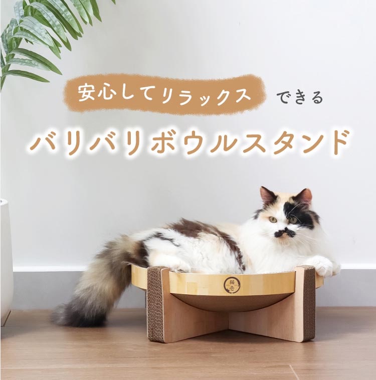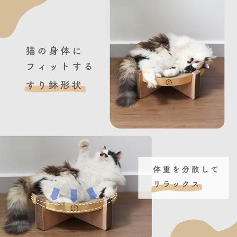 ●猫壱のバリバリボウルは猫のからだにフィットする丸型&すり鉢構造なので、ベッドとしてくつろいだり、爪とぎするのにピッタリ!柄はシンプルな美しい木目調を採用しインテリアに調和します。