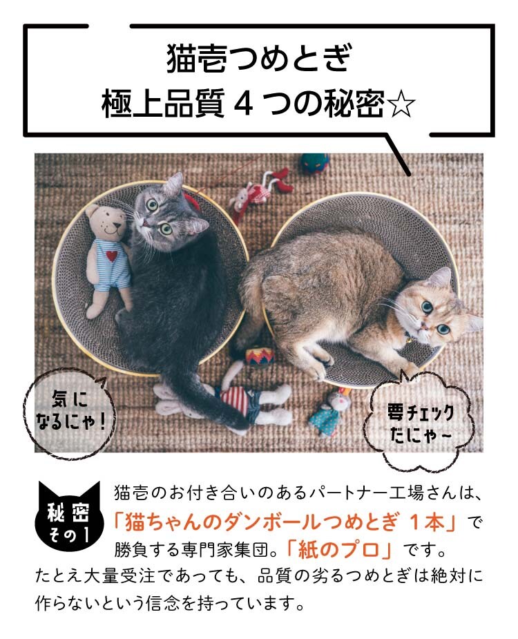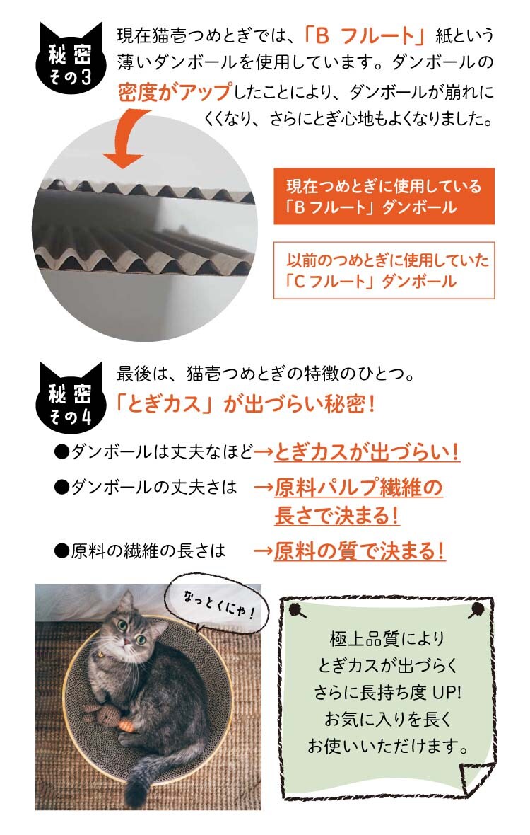 また、つめとぎ部分は目の細かい、薄いダンボールを張り合わせているので、密度が高く、猫のとぎ甲斐アップだけでなく、耐久性も持たせています。