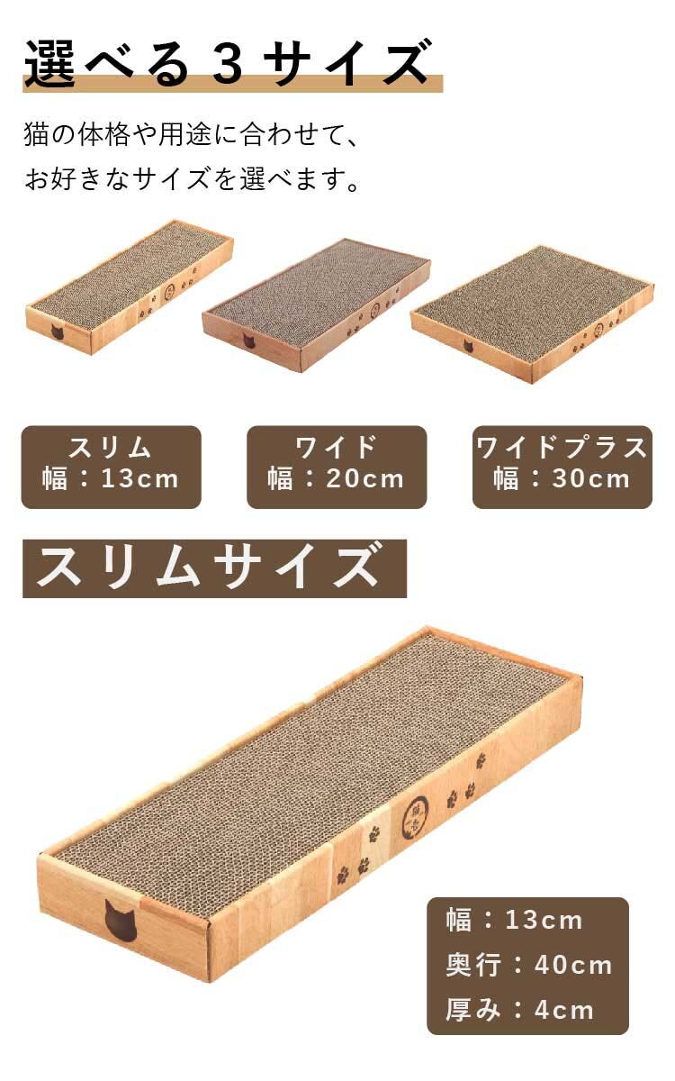 サイズは40*13*4cm。しっかりとした厚みと猫が伸び、つめとぎをするには十分な長さがありながら、横幅は13cmとコンパクト。