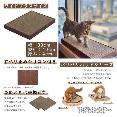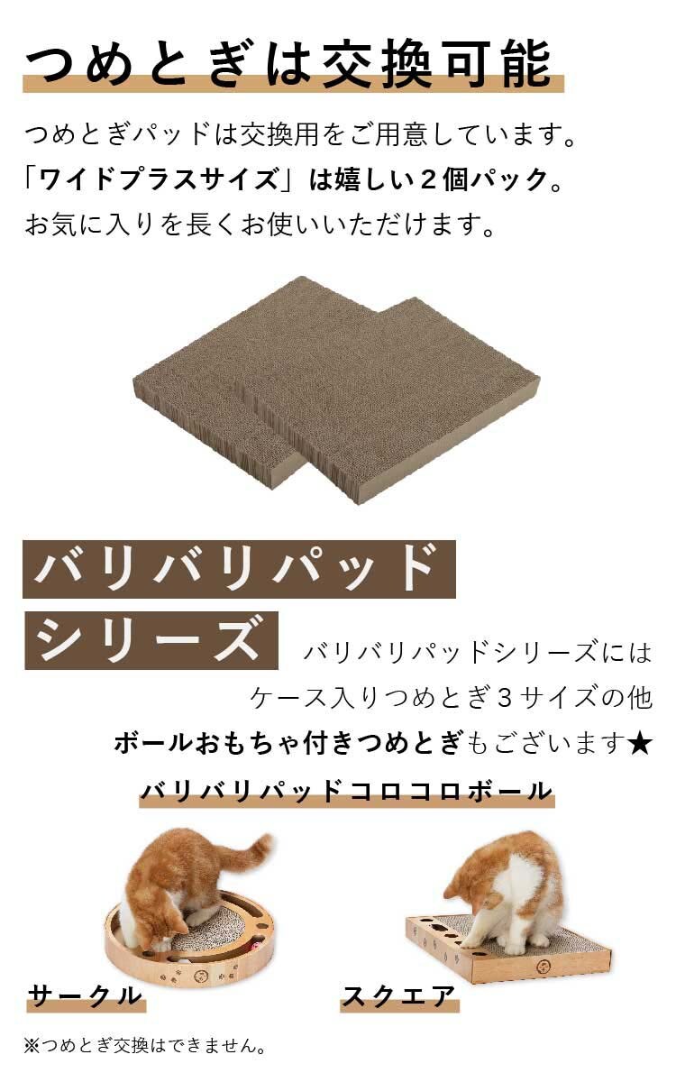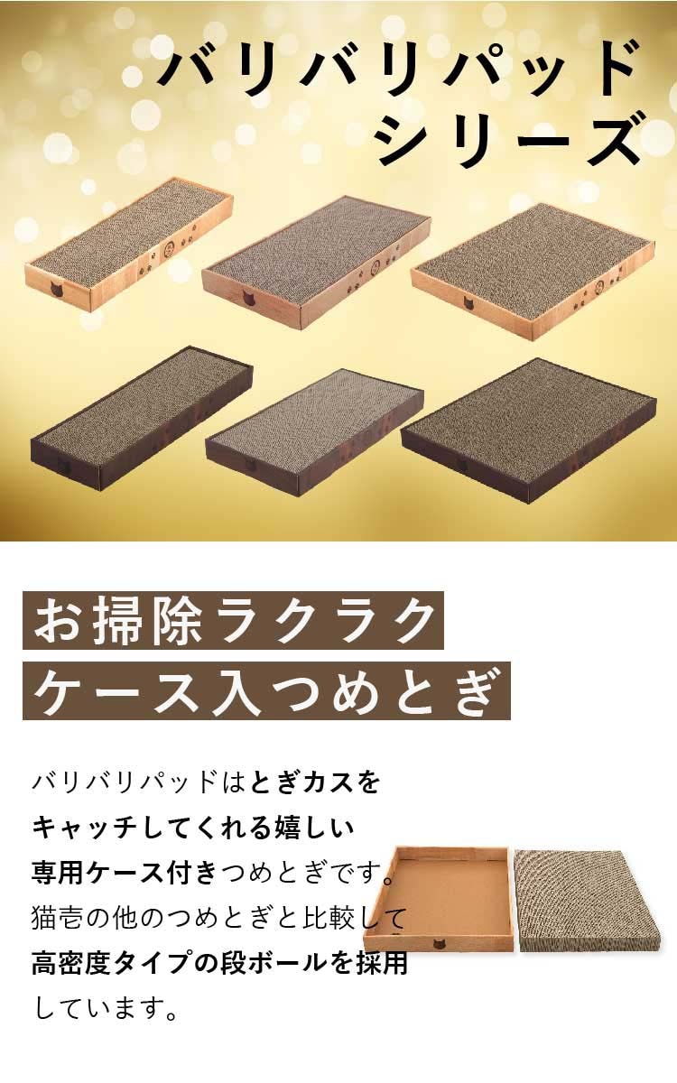 ダンボールの目が細かく、ぎゅっと詰まった高密度タイプのつめとぎ「バリバリパッド」のワイドプラスサイズです。