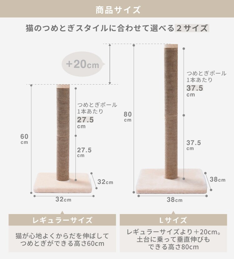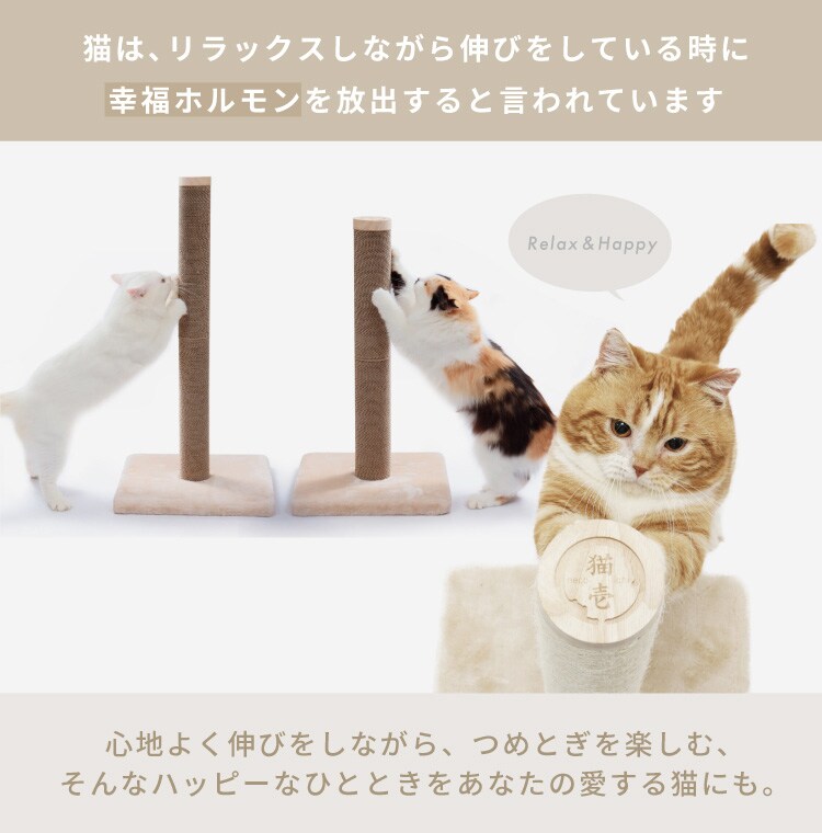 60cmの高さのつめとぎポールで心地よく伸びをしながら、つめとぎを楽しむ、そんなハッピーなひとときをあなたの愛する猫にも。